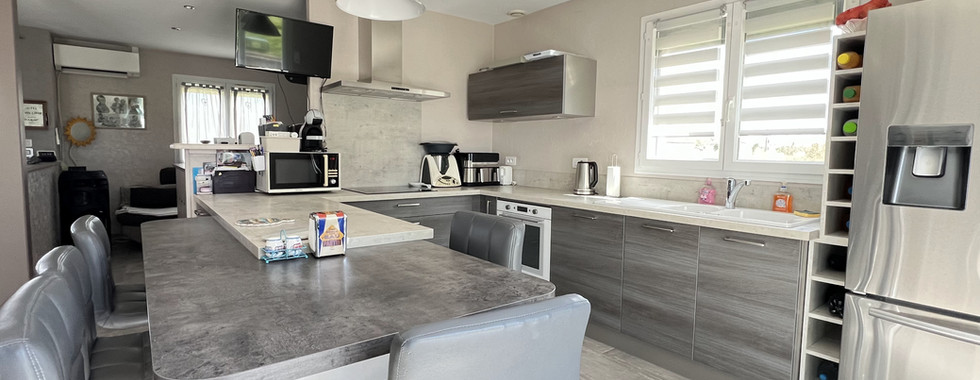 - Pièce de vie de 40 m² avec grande cuisine moderne aménagée et équipée ouverte, sol carrelé. Cette pièce donne accès à une terrasse carrelée de 30 m² avec barbecue et four à pain, accès dans le jardin par escaliers.