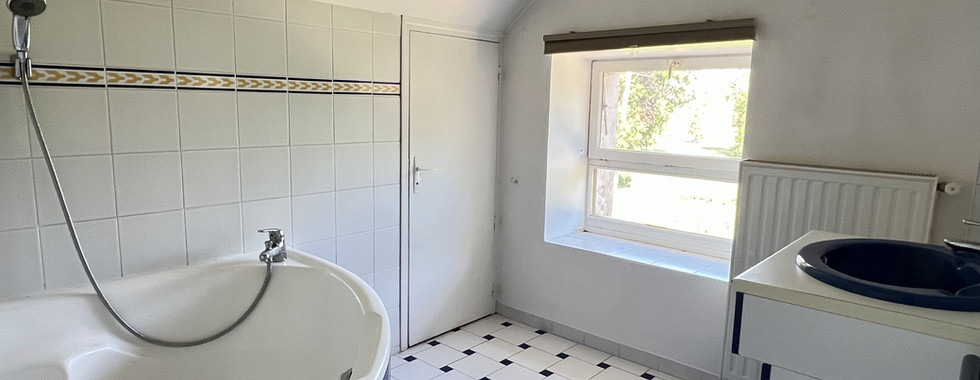 - Petite salle d’eau avec toilettes, sol carrelé, murs faïencés, 1 petite fenêtre